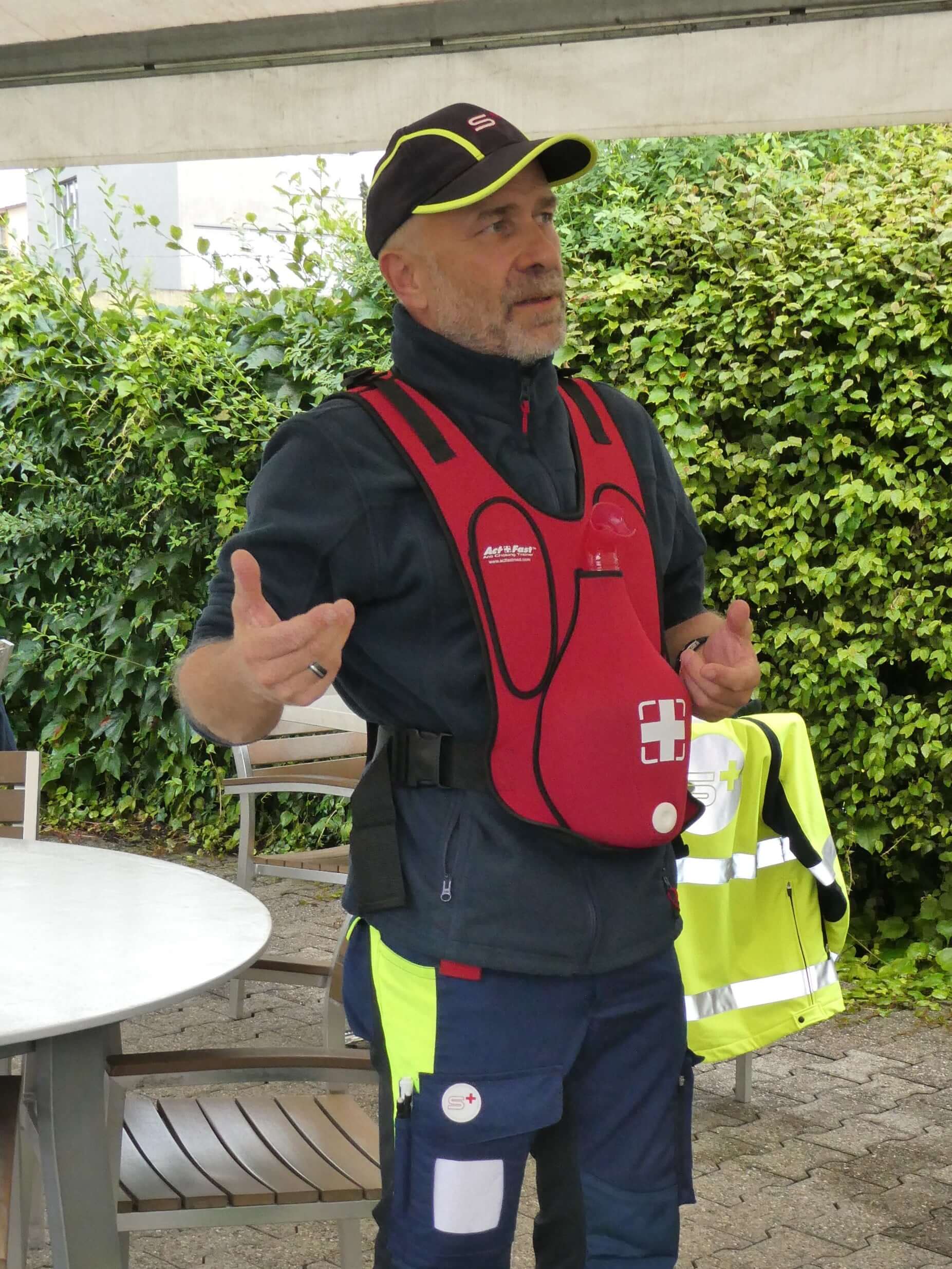 Übungsleiter Hörbi Konrad erklärt das Heimlich-Manöver.
