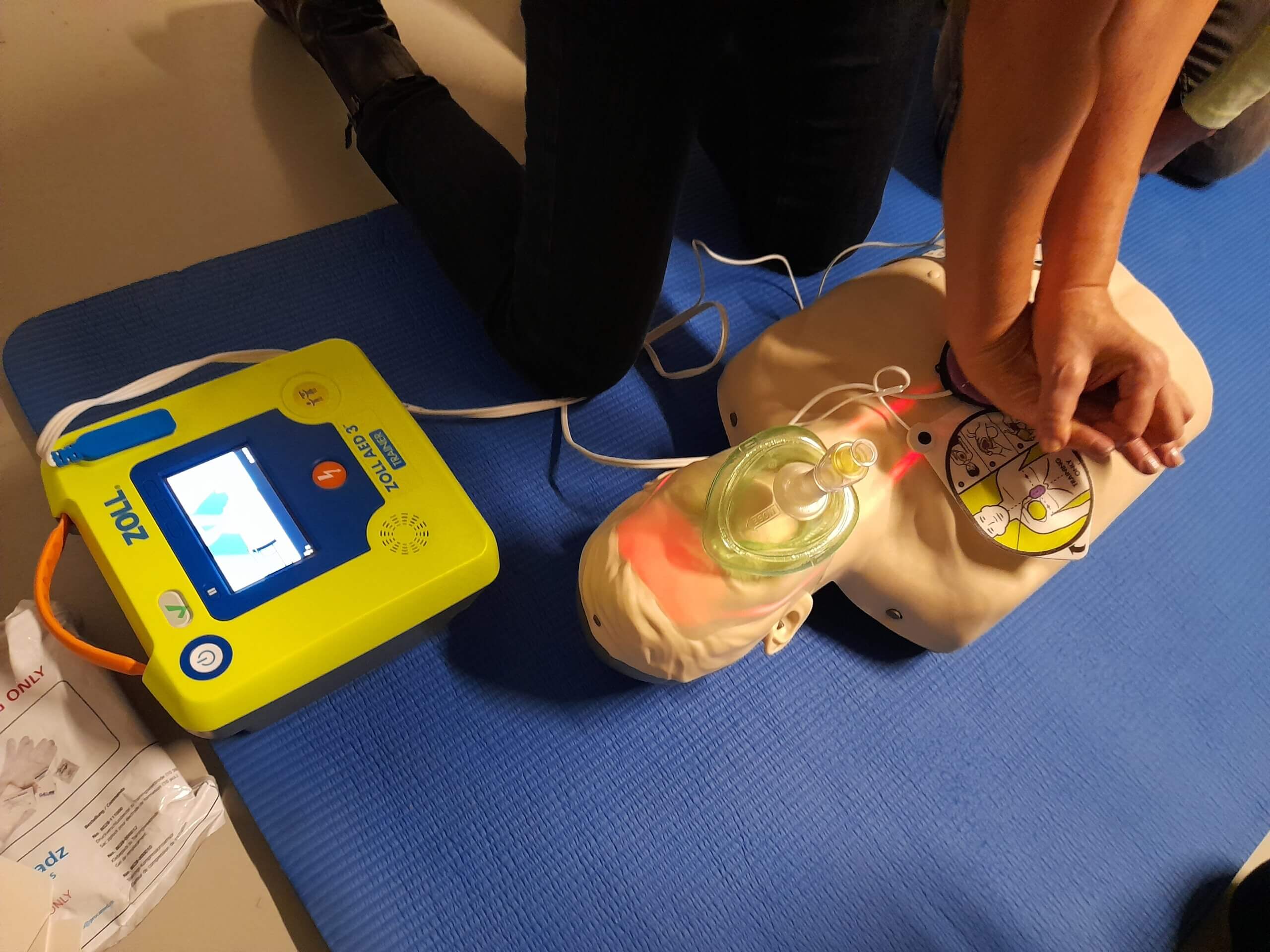 Das AED-Gerät und die Maske werden eingesetzt.