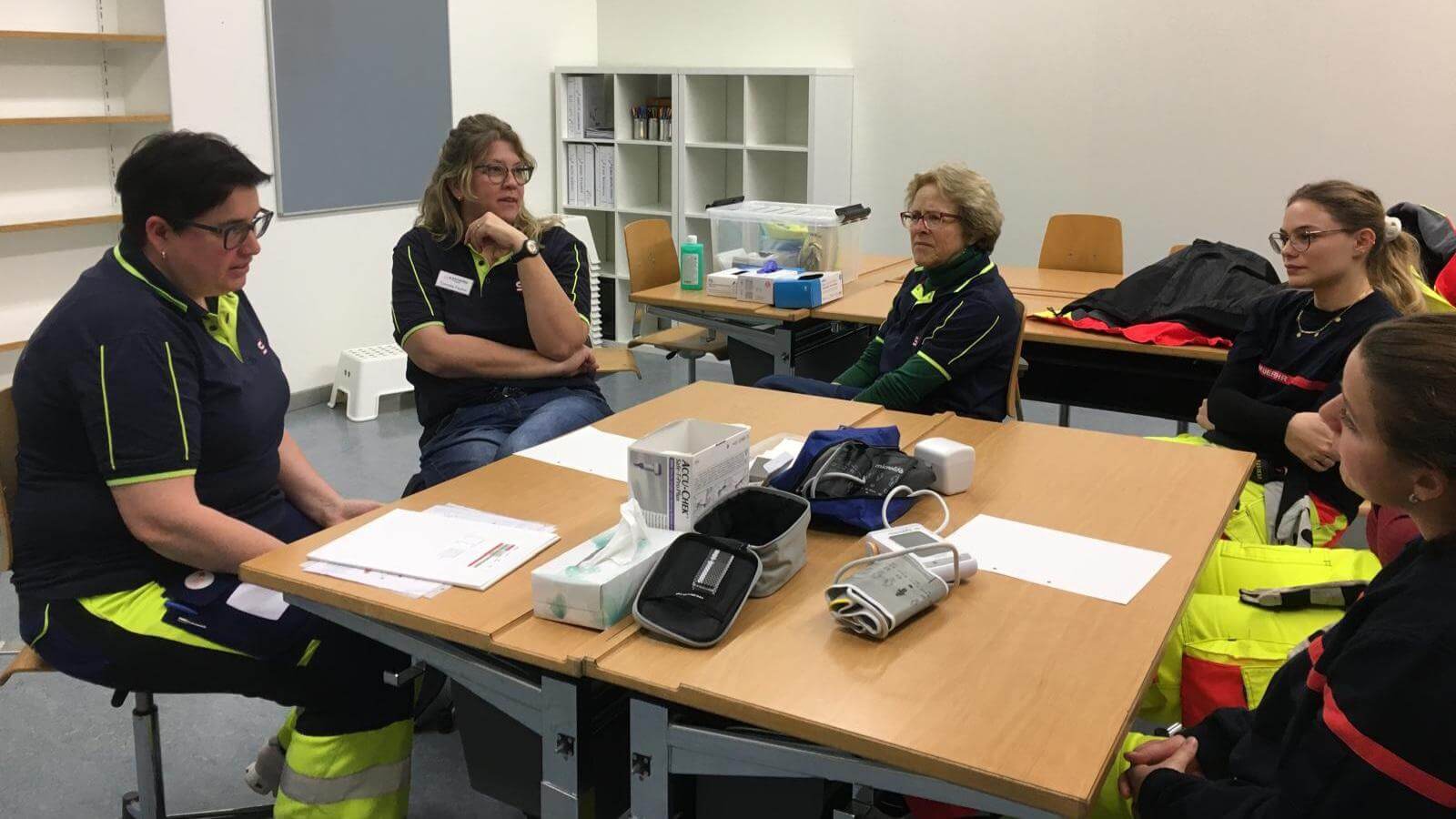 Samariterlehrerin Manuela übt Blutzucker/Blutdruck messen mit ihrer Gruppe.