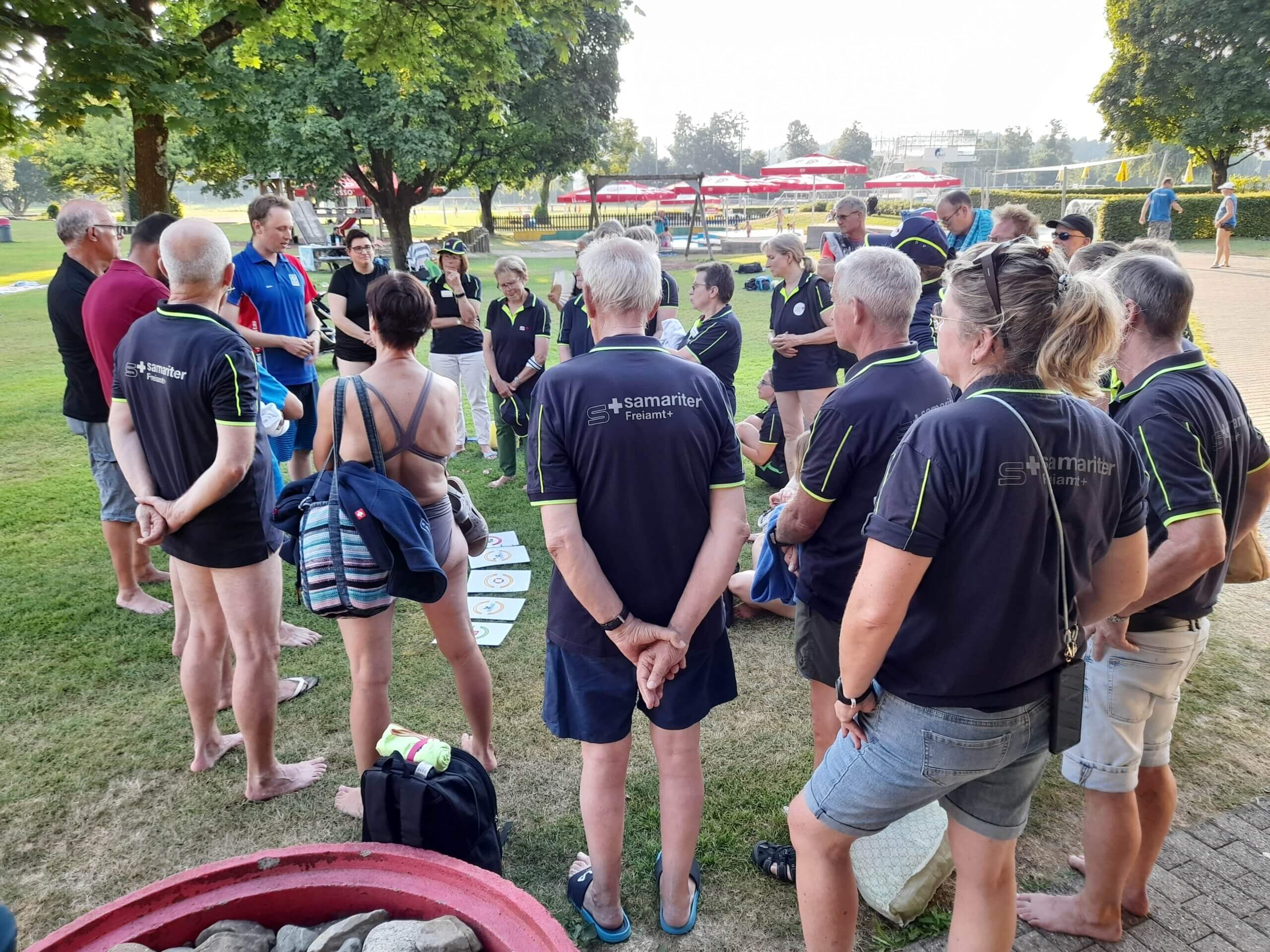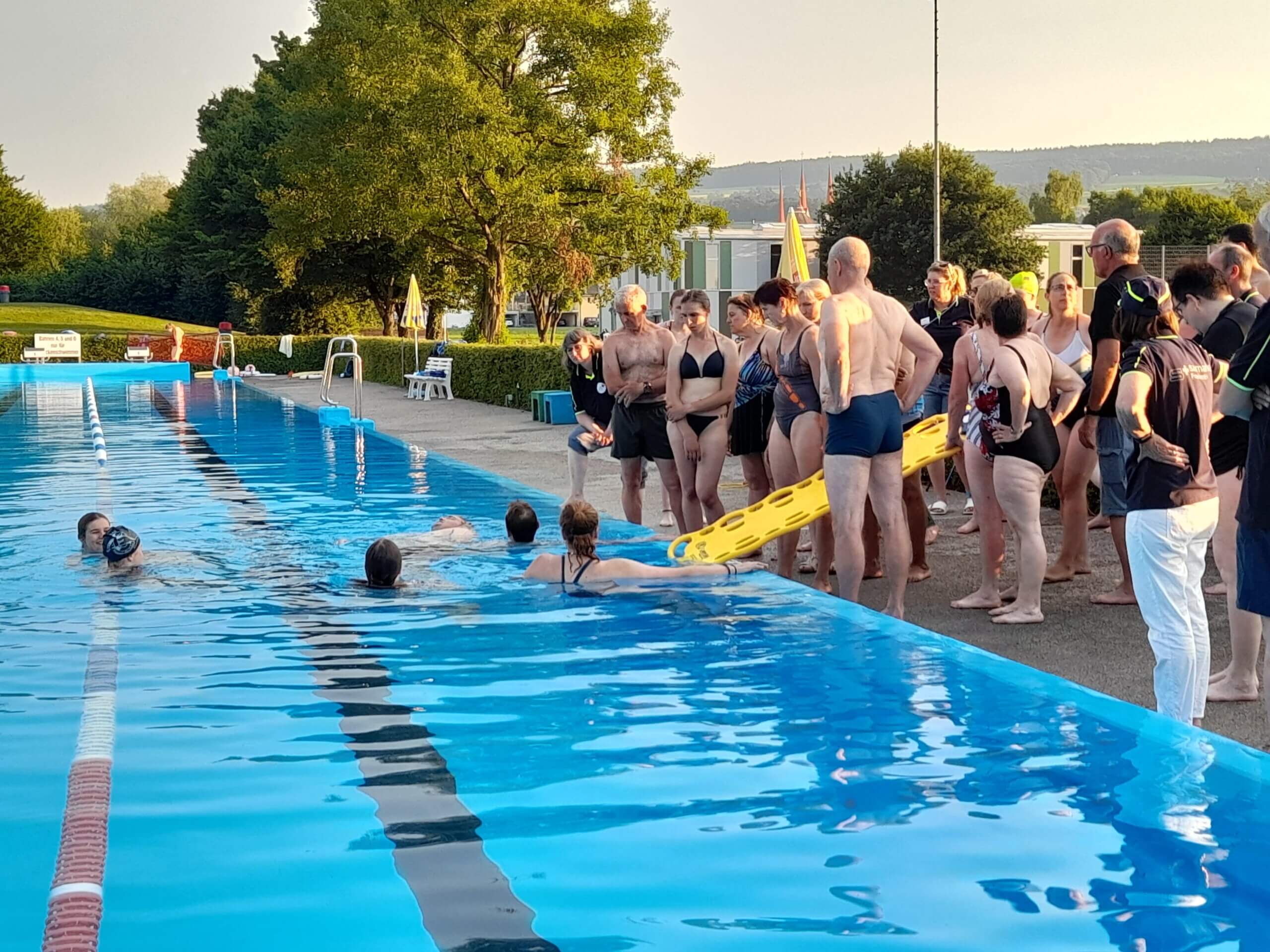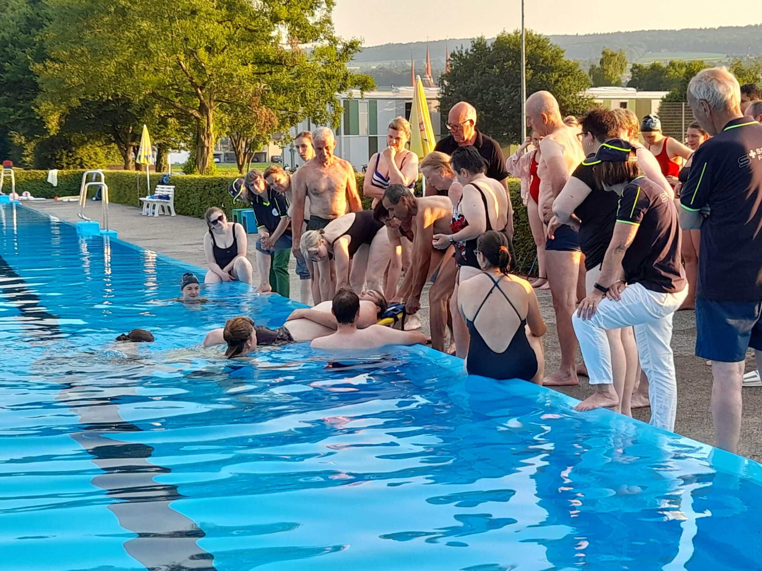 Etwas Theorie zum Anfang von den Übungsleitern Silvio und Manuela.Der Rettling wird ans Ufer gebracht.Die Schwimmhilfe musste dem Rettling genau zugeworfen werden.Das Spine-Board kam zum Einsatz, es wurden verschiedene Techniken geübt.Der bewusstlose Rettling wurde aus dem Wasser gehoben.Lauter frohe Gesichter nach der geglückten Rettung.Es war eine tolle Übung, die Abkühlung machte grossen Spass bei über 30 Grad.Mit Getränken und feinen Kuchen genossen alle das gemütliche Zusammensein zum Schluss.Vielen Dank ans Badi-Muri-Team, an alle Bäcker/innen, an die SRLG und an Manuela, Kurt und Silvio für die erfrischende Übung. Es hat Spass gemacht!