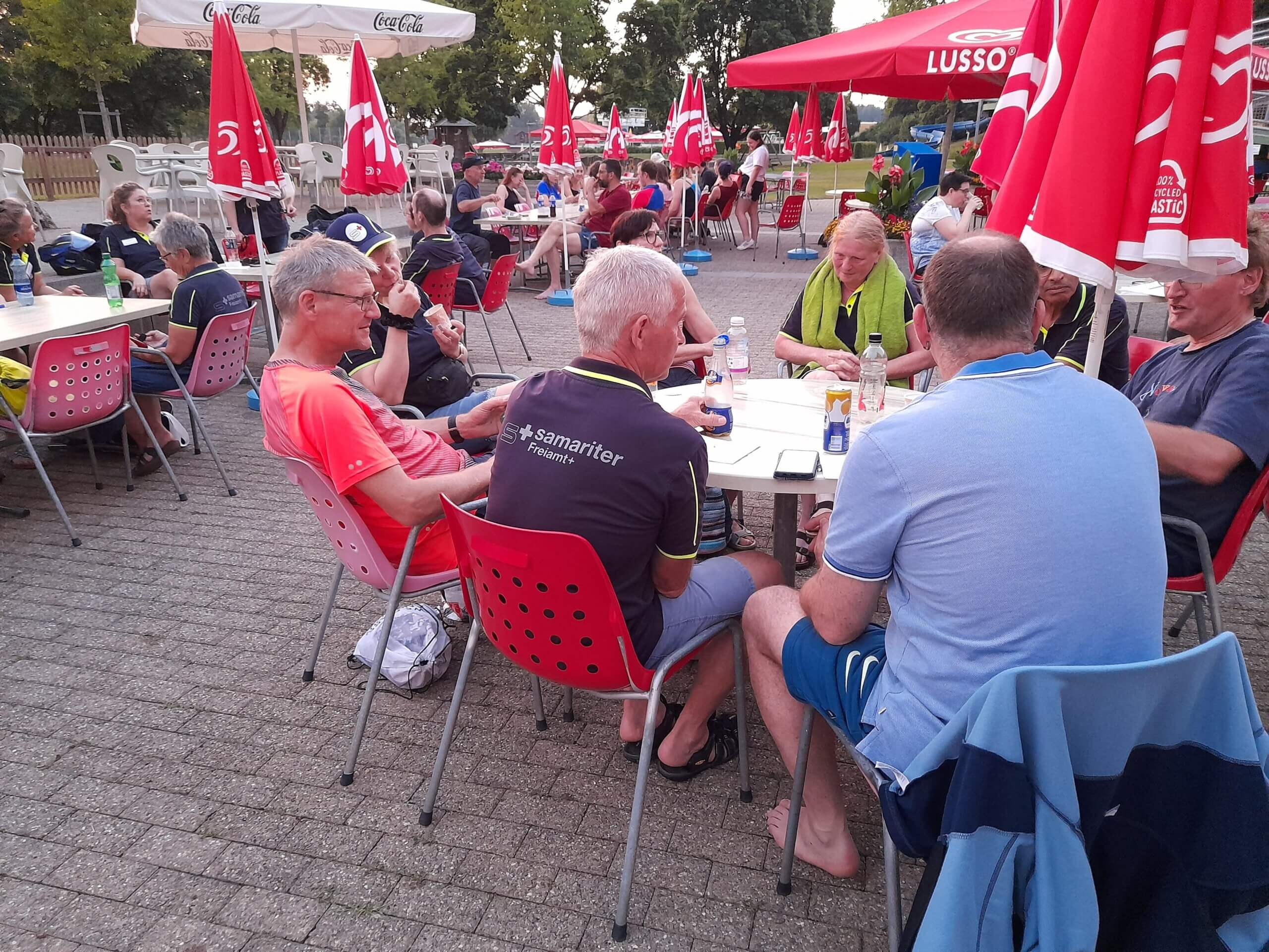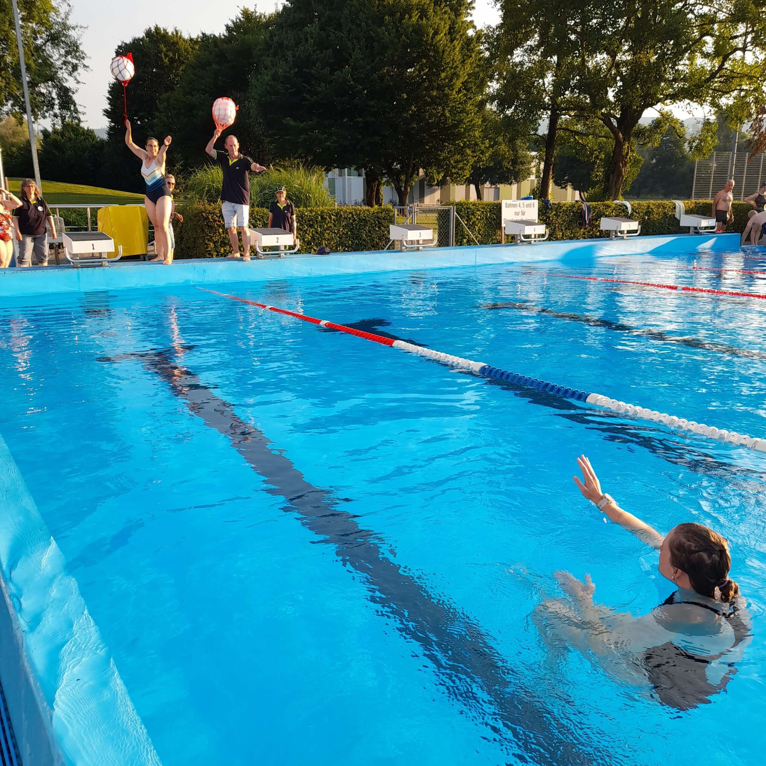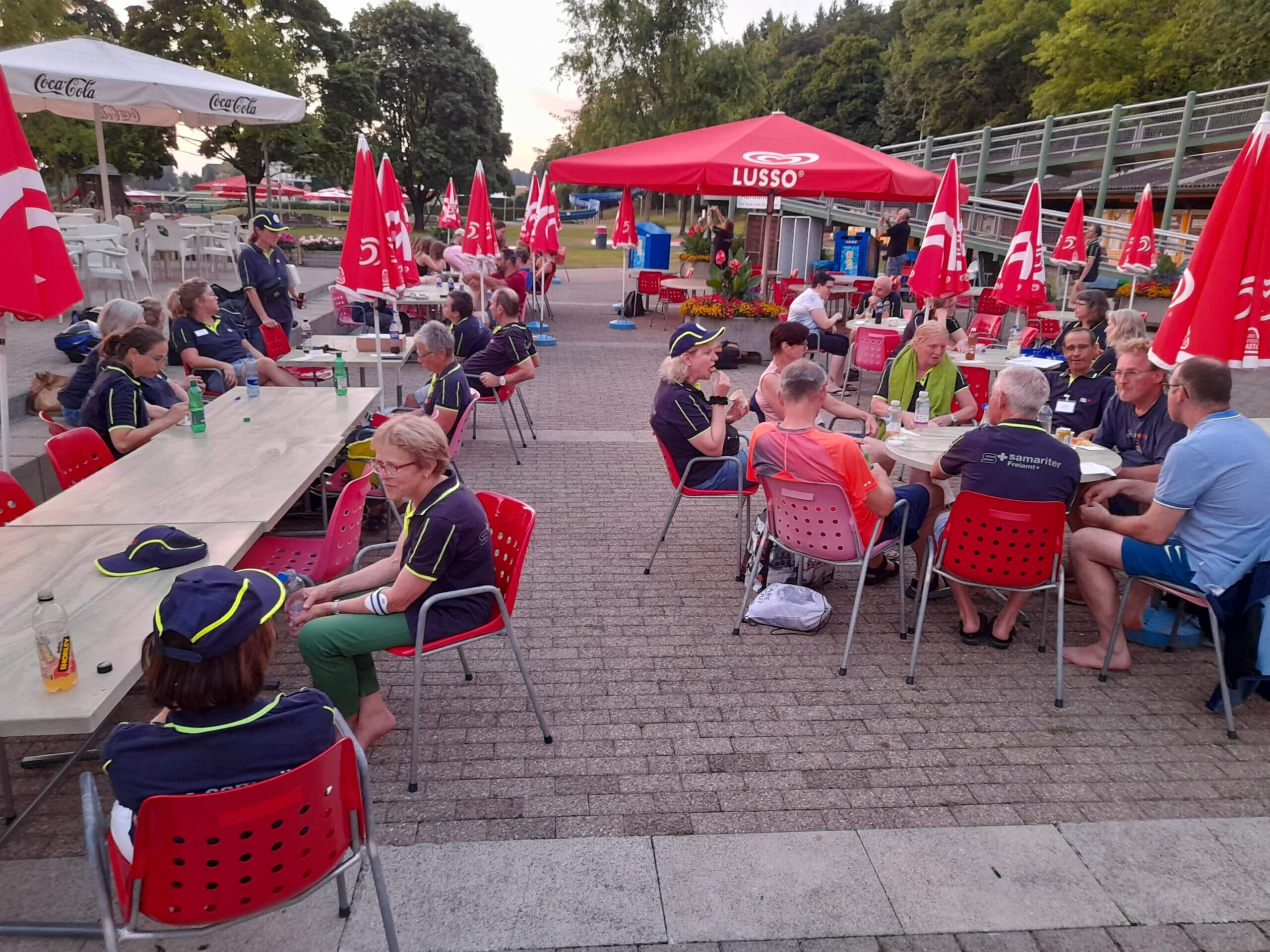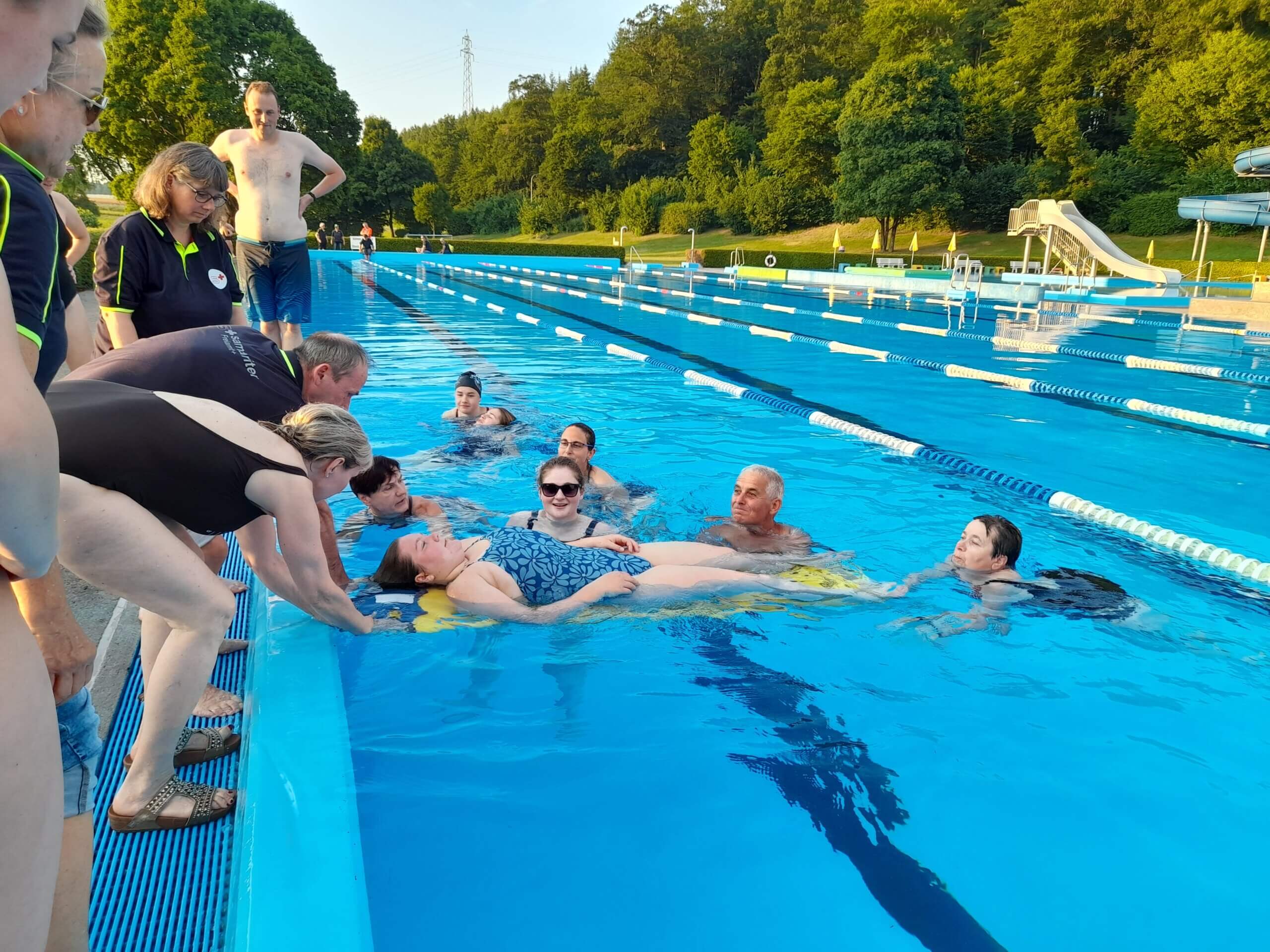 Etwas Theorie zum Anfang von den Übungsleitern Silvio und Manuela.Der Rettling wird ans Ufer gebracht.Die Schwimmhilfe musste dem Rettling genau zugeworfen werden.Das Spine-Board kam zum Einsatz, es wurden verschiedene Techniken geübt.Der bewusstlose Rettling wurde aus dem Wasser gehoben.Lauter frohe Gesichter nach der geglückten Rettung.Es war eine tolle Übung, die Abkühlung machte grossen Spass bei über 30 Grad.Mit Getränken und feinen Kuchen genossen alle das gemütliche Zusammensein zum Schluss.Vielen Dank ans Badi-Muri-Team, an alle Bäcker/innen, an die SRLG und an Manuela, Kurt und Silvio für die erfrischende Übung. Es hat Spass gemacht!